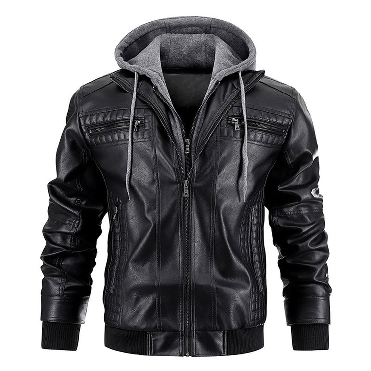 Hooded Jacket With Zipper Pockets Fashion Warm Pu Leather Coat Mens Clothing