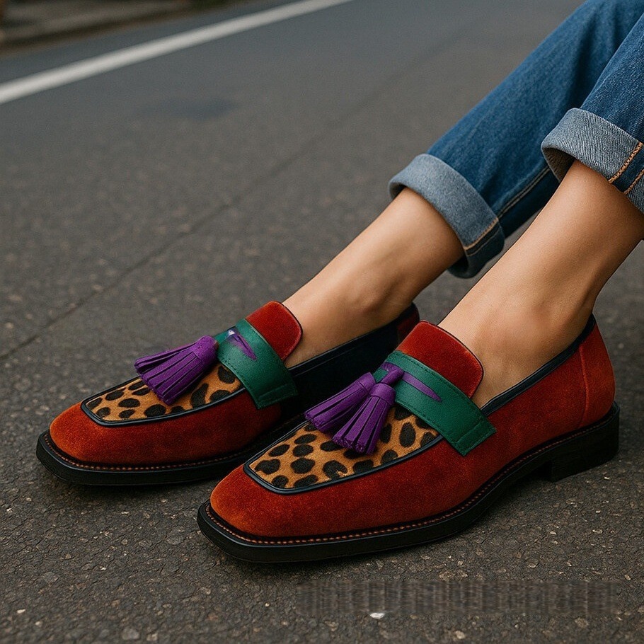 Women's Retro Square Head Tassel Leopard Print Color Matching Low Heel Shoes